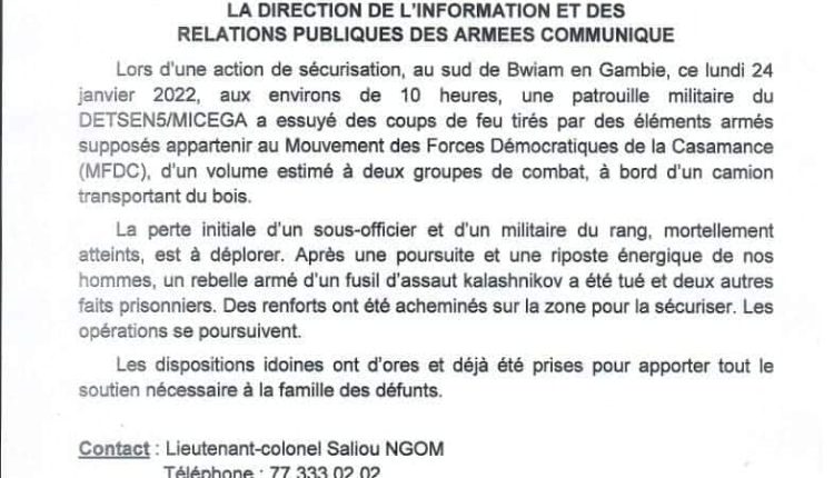Lors d’une action de sécurisation, au Sud de Bwiam en Gambie, ce lundi 24 janvier 2022, aux environs de 10 heures, une patrouille militaire du DETSEN5/MICEGA a essuyé des coups de feu tirés par des éléments armés supposés appartenir au Mouvement des Forces Démocratiques de la Casamance (MFDC), d’un volume estimé à deux groupes de combat, à bord d’un camion transportant du bois.