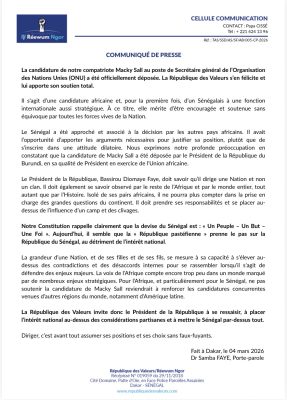 La candidature de notre compatriote Macky Sall au poste de Secrétaire général de l’Organisation des Nations Unies (ONU) a été officiellement déposée. La République des Valeurs s’en félicite et lui apporte son soutien total.