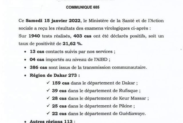 Le ministère de la Santé et de l’action sociale a reçu les résultats des examens virologiques de ce samedi 15 janvier 2022 ci-après: