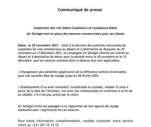 La mesure visant à prévenir la propagation du virus dans le royaume, s’étale sur deux semaines. Elle vise ainsi a préserver les acquis réalisés par le pays dans la lutte contre la pandémie, selon un communiqué. Eu égard à cette mesure, Air Sénégal suspend ses vols vers le Maroc jusqu’à nouvel ordre.