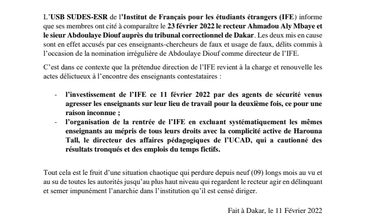 Les membres de l’USB Sudes de l’Institut français pour les étudiants étrangers (IFE) ont cité à comparaître le 23 février 2022, le Recteur Ahmadou Aly Mbaye et Abdoulaye Diouf auprès du tribunal correctionnel de Dakar. Selon un communiqué rendu public, ce vendredi, les syndicalistes précisent que les deux mis en cause sont accusés par les enseignants-chercheurs de faux et usage de faux, délits commis à l’occasion de la nomination irrégulière de Abdoulaye Diouf comme directeur de l’IFE.