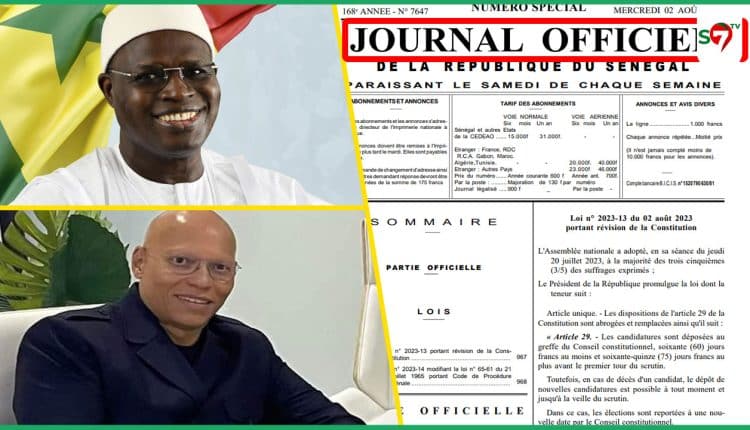 L’ancien Maire de Dakar, Khalifa Ababacar Sall & l’ancien ministre Karim Meissa Wade respectivement candidats de Taxawu Senegal & du Parti Démocratique Sénégalais ont officiellement recouvrés leurs droits civiques et politiques, selon le journal officiel ci-dessous.